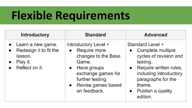 Teaching that many new games to six or seven groups in 40 minutes (and giving them time to play) is a huge task. I've used games in class for 25 years, so I know how to teach them quickly and effectively. You'll make your life easier if you pick one game everyone has to redesign.
